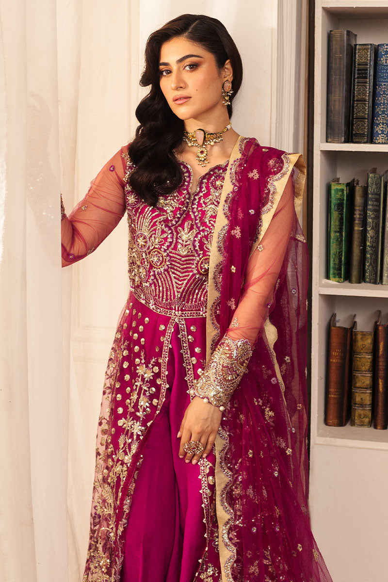 This striking fuchsia ensemble is adorned with exquisite embroidered and sequinned details, creating a bold yet graceful look. The rich fuchsia pink hue is enhanced by intricate embellishments, making it a perfect choice for any festive occasion. Paired with luxurious fabrics and delicate craftsmanship, this outfit ensures you stand out with elegance and flair.